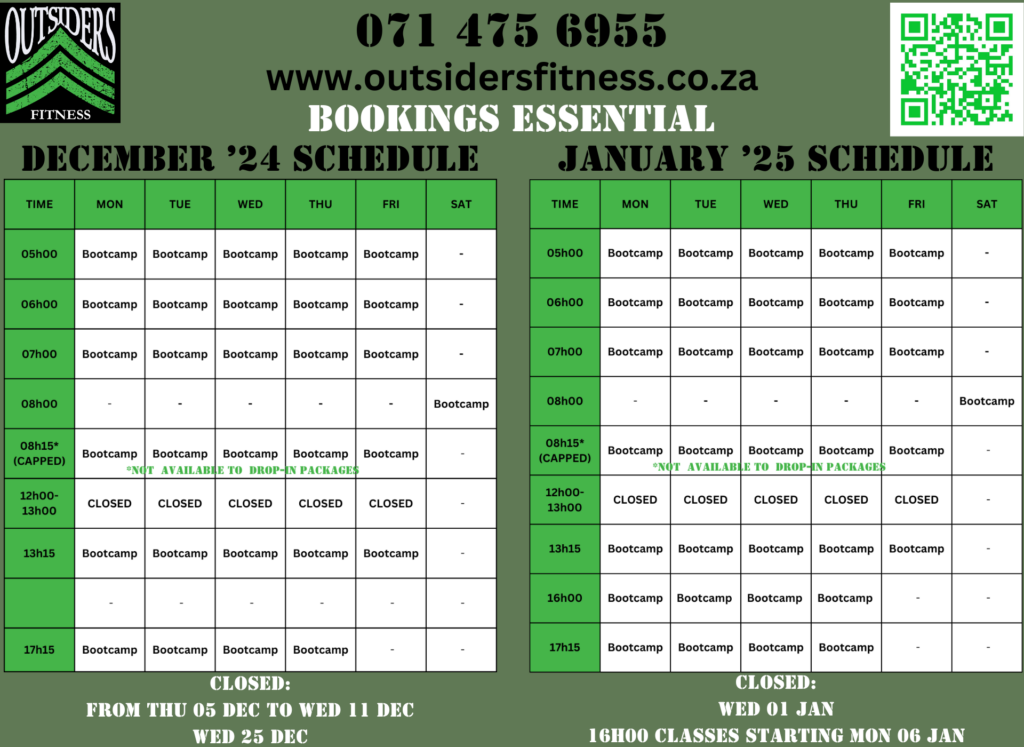 • We’ll be taking a short break from Thursday, 5 December, to Wednesday, 11 December, to recharge and celebrate a special occasion—our son’s graduation in Stellenbosch. The gym reopens on Thursday, 12 December, so book your spots!